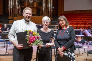 Dr. Philipp Weber (links) hat für seine Arbeit „Die Stimme des Gewissens. Elemente einer Literaturgeschichte“ den gdf-Preis (Wilhelm-Hollenberg-Preis) erhalten. Prof. Dr. Kornelia Freitag (mitte) überreichte den Preis gemeinsam mit Marita Schmeink (rechts) von der gdf beim Semesterkonzert im Juli. Mehr Informationen zur Gesellschaft der Freunde der Ruhr-Universität Bochum e.V. finden Sie hier.