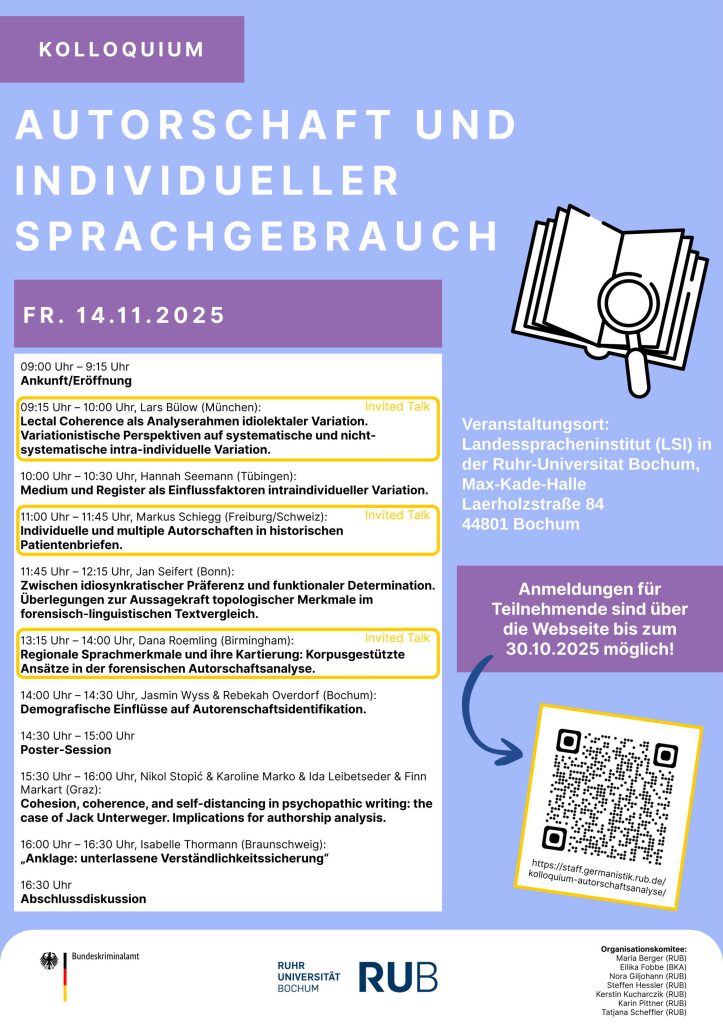 Am 14.11.2025 findet in der Max-Kade-Halle (LSI) das linguistische Kolloquium „Autorschaft und individueller Sprachgebrauch“ statt. Die Veranstaltung wird gemeinsam organisiert von der Germanistischen Linguistik, der Digitalen Forensischen Linguistik und dem Bundeskriminalamt Wiesbaden. Nähere Informationen: https://staff.germanistik.rub.de/kolloquium-autorschaftsanalyse/