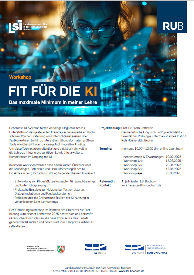 dniPROnrw organisiert eine monatlich stattfindende digitale Fortbildungsreihe zur fremdsprachlichen KI-Didaktik mit Anja Häusler (Bochum). Kontaktieren Sie uns gerne unter Team/Kontakt für Termine und Zugangsdaten.