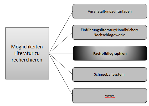 Von den verschiedenen Möglichkeiten der Literaturrecherche bieten sich zum Einstieg der Blick in die eigenen Seminarunterlagen (Skripte, ausgedruckte Präsentationsfolien, Hinweise des Dozenten etc.) sowie der Blick in Einführungsliteratur oder Nachschlagewerke an (bei Einführungsliteratur lohnt ein Studium des Literaturverzeichnisses, bei Nachschlagewerken ein Blick auf die Literaturhinweise unter Artikeln). Von hier aus kann mit dem Schneeballsystem weitergearbeitet werden. Die einzig systematische Literaturrecherche läuft allerdings über die Bibliographien – das Schneeballsystem zumindest mit der Recherche mit Hilfe von Bibliographien zu kombinieren, ist dringend zu empfehlen.