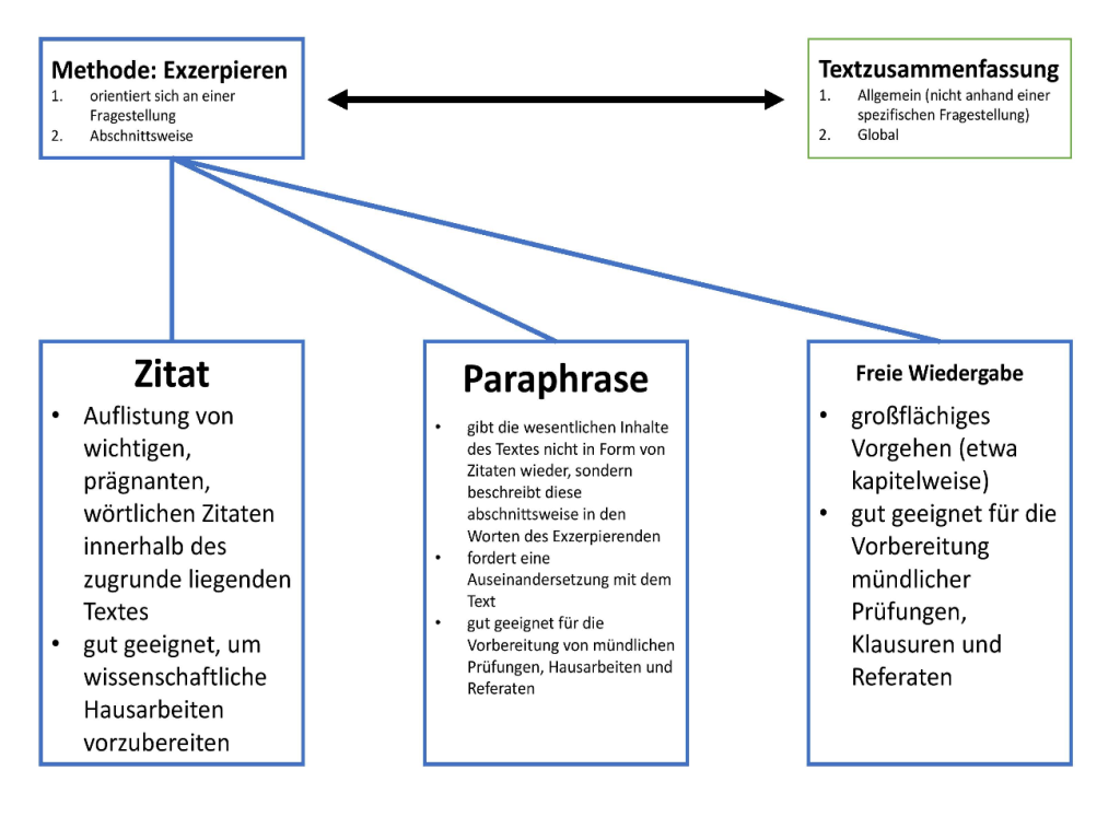 Exzerpte können 1. wörtliche Abschriften wichtiger Textpassagen sein (= Zitat) oder 2. wichtige Stellen des Textes in eigenen Worten wiedergeben (= Paraphrase).