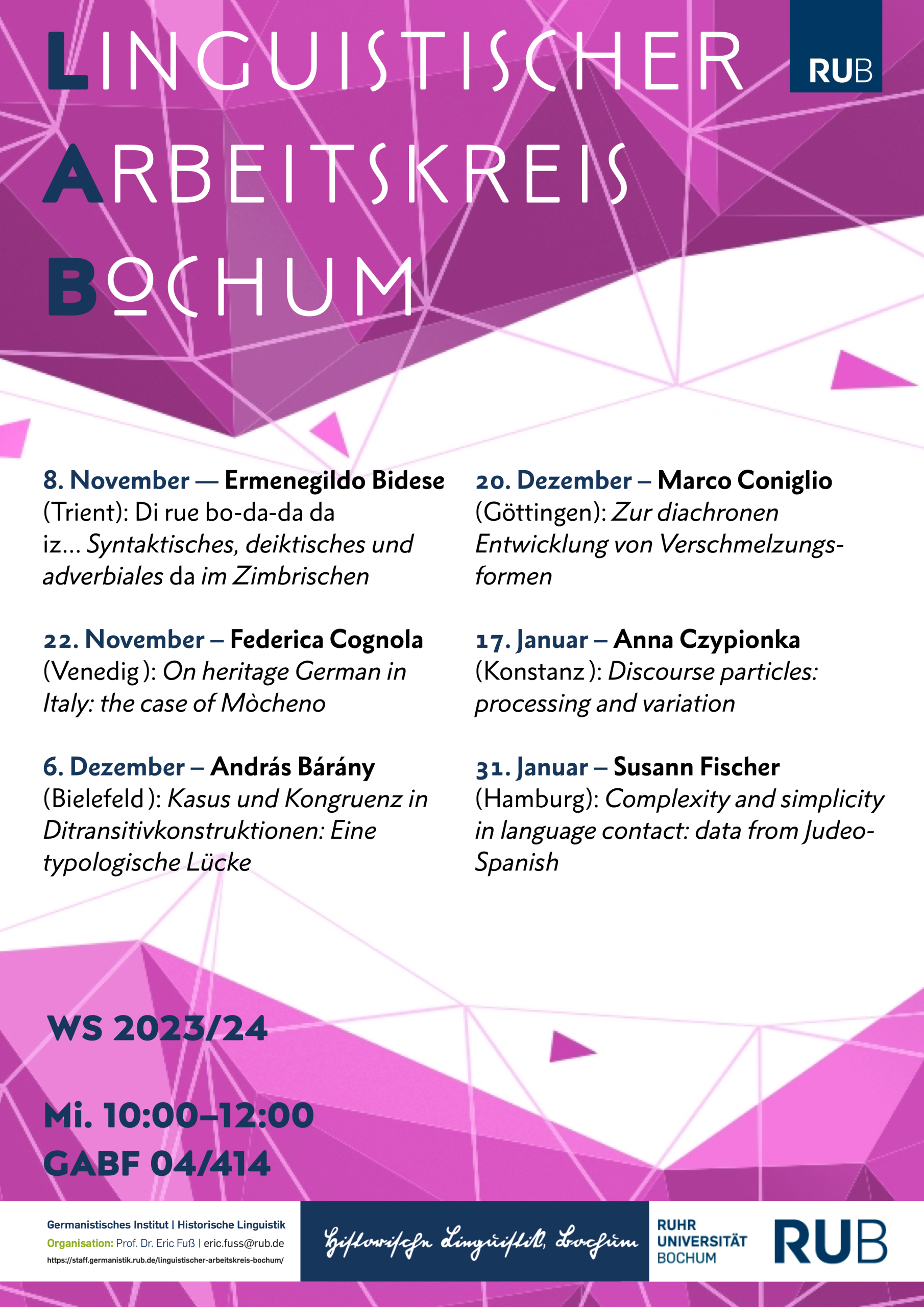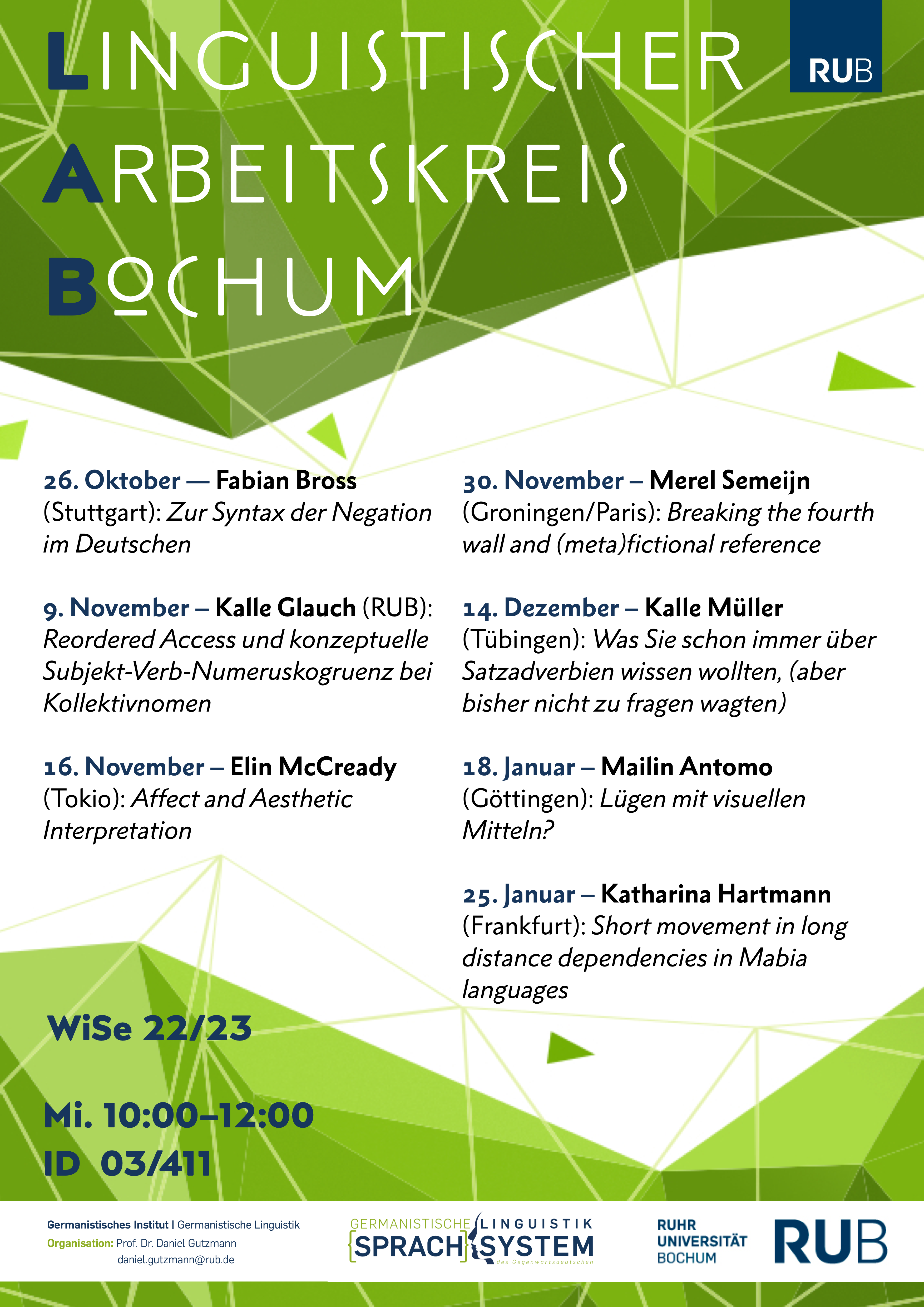 Der Linguistische Arbeitskreis Bochum (LAB) ist das gemeinsame Vortragkolloquium der Germanistischen Linguistik am Germanistischen Institut der Ruhr-Universität Bochum. Jedes Semester laden wir regelmäßig Mittwoch von 10:00–12:00 zu linguistisches Fachvorträgen von nationalen und internationalen Kolleg*innen ein. Der LAB wird jedes Semester von einem unterschiedlichen Lehrstuhl der Germanistischen Linguistik organisiert. Neben allen linguistischen Kolleg*innen der RUB sind auch Studierende herzlich zum LAB eingeladen, der auch als Lehrveranstaltung besucht werden kann, wodurch es Studierenden frühzeitig ermöglicht wird, mit verschiedenen aktuellen linguistischen Forschungsdebatten in Berührung zu kommen.